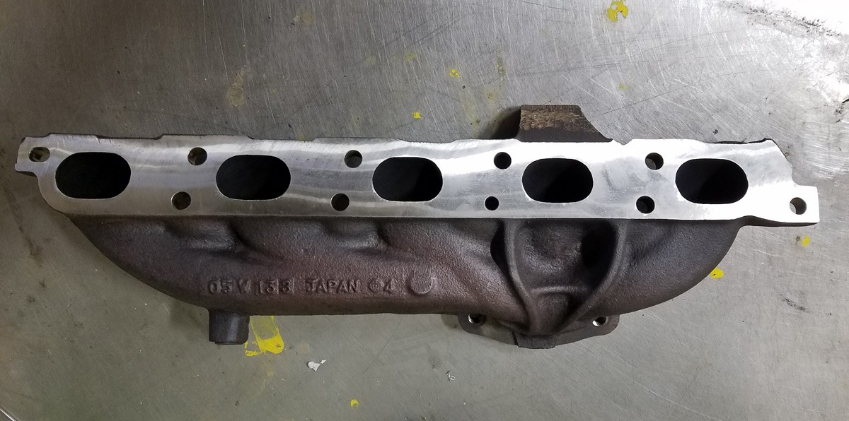 We take the best-flowing stock manifold available and modify it to fit a T3 flange turbo. We use a CNC milling machine to fly-cut both mating surfaces to ensure a perfect seal with no leaks. Then we port the exhaust outlet to allow maximum flow. We also remove the mounting boss for the factory heat shield to allow as much clearance as possible between the turbo and the engine. Lastly, we enlarge and tap the mounting holes for the turbo to M10 so they can handle the increased weight of a large-frame turbo.